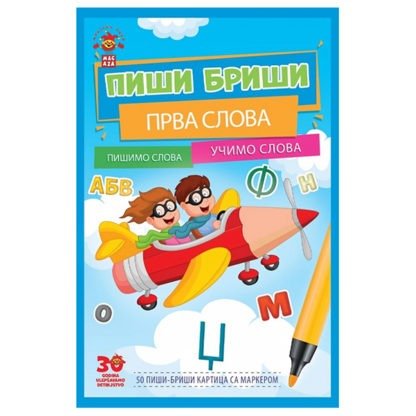 Set od 50 piši-briši karata deci će pomoći da na jendostavan i zabavan način nauče azbuku, pisanje prvih slova i slaganje prvih reči. Na svakoj kartici nalazi se slika i naziv kako bi se učenje učinilo delotvornijim. Unosom tačnog slova na zadato mesto, dete razvija sposbnost rešavanja problema.