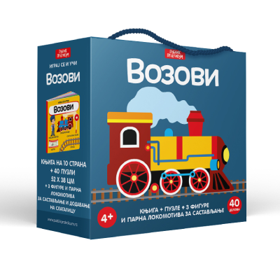 Kutija pune zabave i učenja, sadrži knjižicu od 10 strana, slagalicu od 40 delova, 3 figure i parnu lokomotivu za sklapanje.