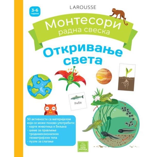 Na početku, vaše dete će otkriti materijale i boje, a mnogobrojne aktivnosti omogućiće mu da nauči da se snalazi u vremenu i prostoru. Pritom, dete će otkriti živi svet i svoje okruženje zahvaljujući karticama s životnim ciklusima, životinjama i biljkama. Od deteta će se tražiti da razvrstava, upoređuje, vizuelno razdvaja i manipuliše trodimenzionalnim geometrijskim telima. Kako bi realizovalo brojne aktivnosti, zasnovane na Montesori pedagogiji, dete će koristiti materijal koji je priložen na kraju sveske: